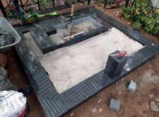 Когда подготовительные работы на территории могилы были завершены, мы принялись за укладку брусчатки на пескобетон, сама плитка была уложена вровень с облицованным гранитными плитами цоколем. Параллельно с этим мы подготовили основание для последующей установки надгробья.
